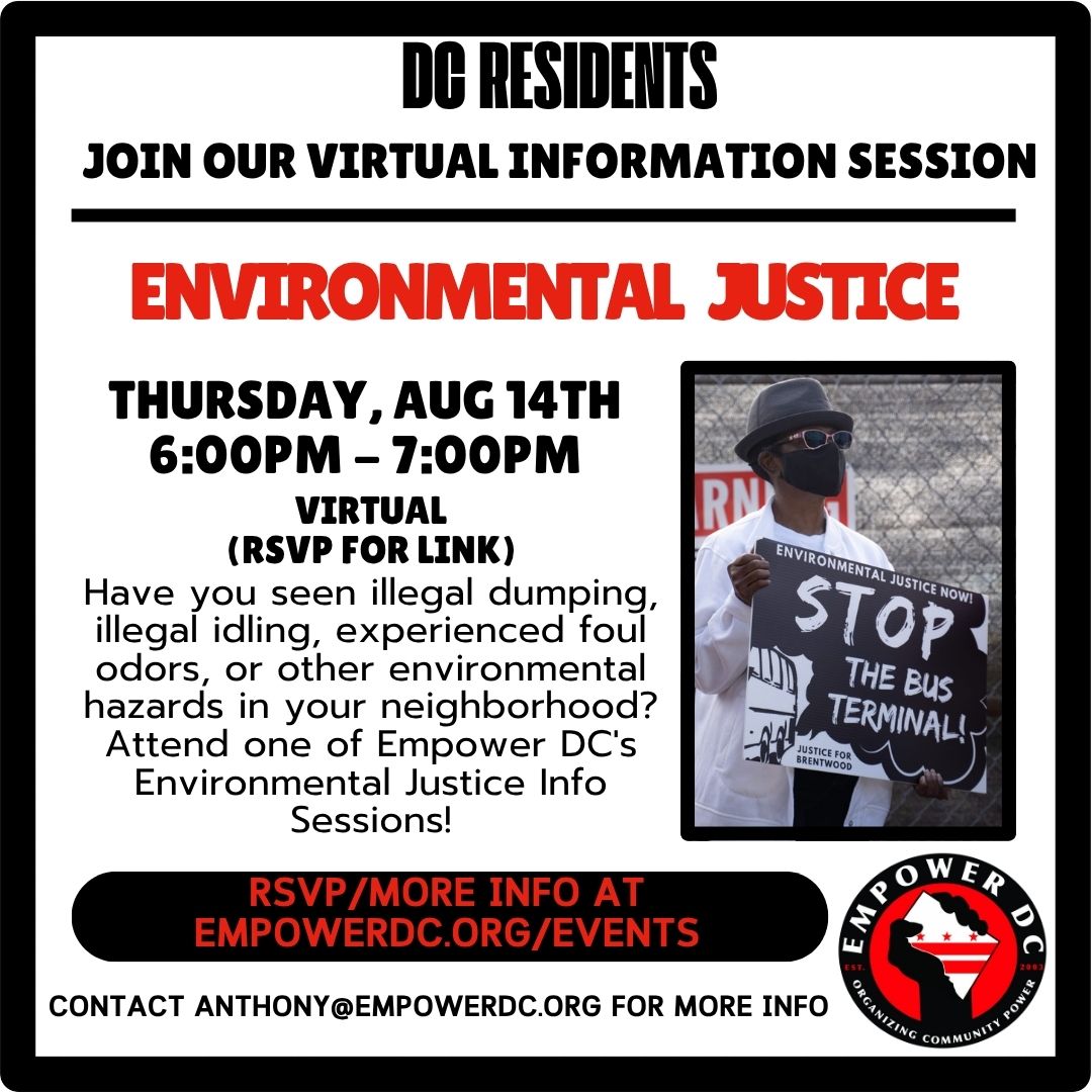Join Empower DC's Environmental Justice Info Session to learn about DC’s environmental laws and ways we can enforce violations, work towards accountability, and build community power to address environmental injustices.